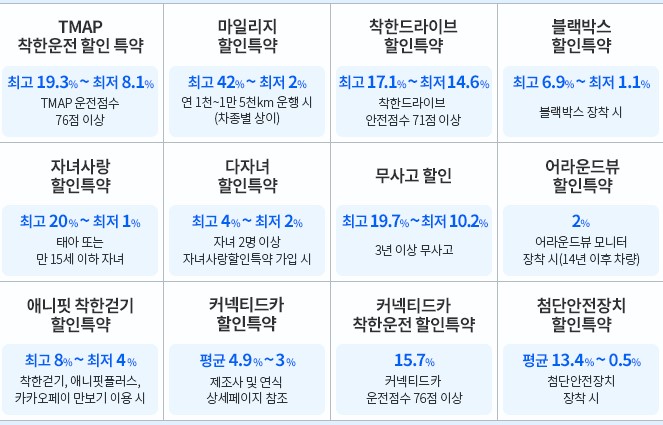 2. 보험회사에 따라 선택 특약으로 ➀ 인터넷 가입, ➁ 블랙박스, ➂ 커넥티드카 할인, ➃ 어라운드뷰, ➄ 걸음수 할인 등 다양하게 있습니다.